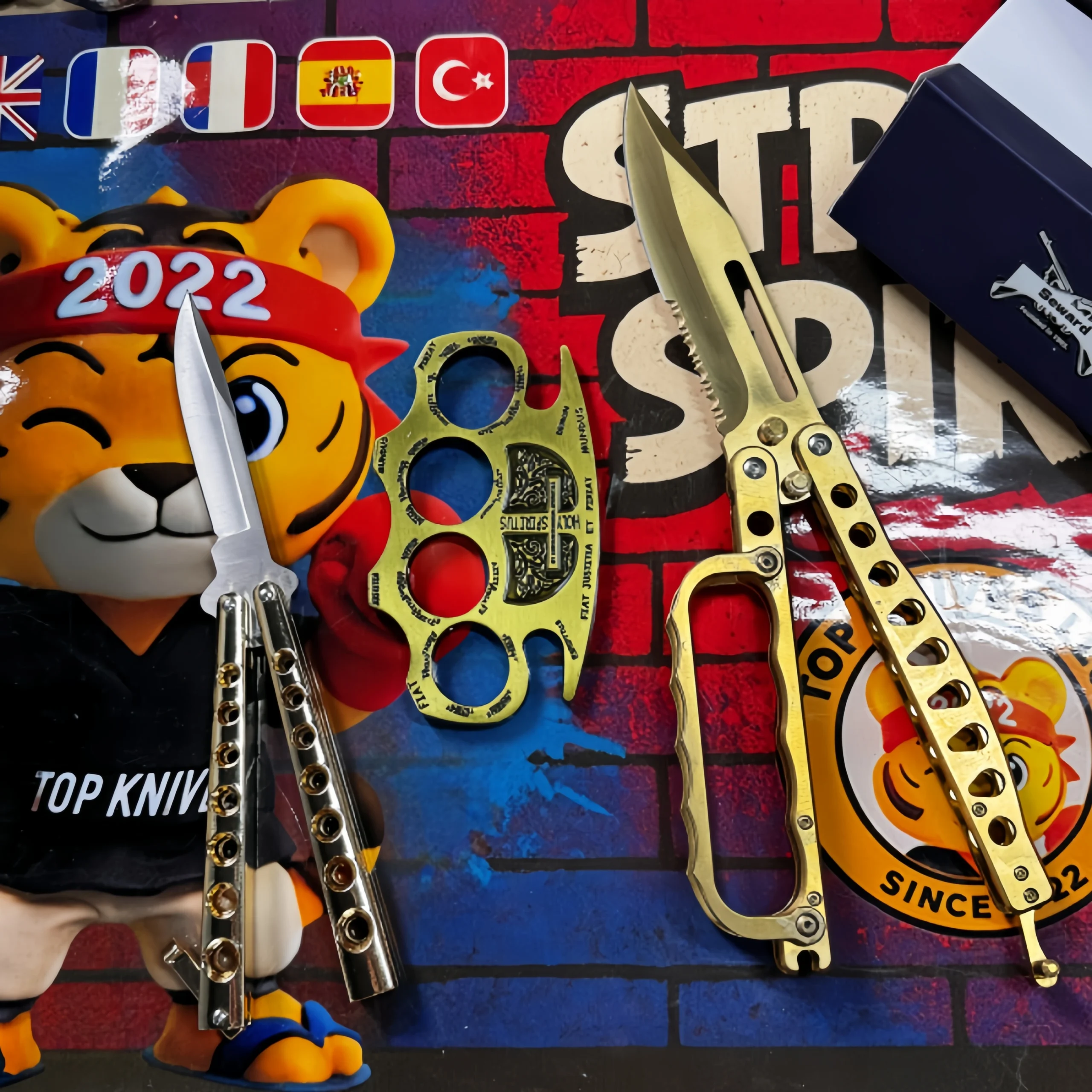 A brass knuckle butterfly knife