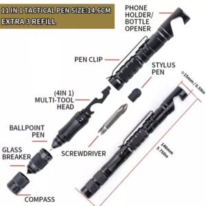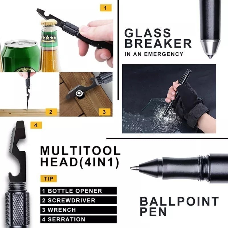 Key Features: Multi-Function Design: Combines a pen, flashlight, window breaker, and screwdriver. Durable Construction: Made with high-quality materials for long-lasting use. Compact & Portable: Easy to carry in your pocket, backpack, or glove compartment. Powerful LED Flashlight: Ideal for illuminating dark environments. Emergency Tools: Equipped with a glass breaker and various tips for practical use. Sleek & Tactical: Stylish, yet rugged, black finish for a professional look.Practical Tactical Pen Tungsten Steel Glass Breaker Self Defense Tactical Survival Pens Multifunction Brass Whistle Defence Pen