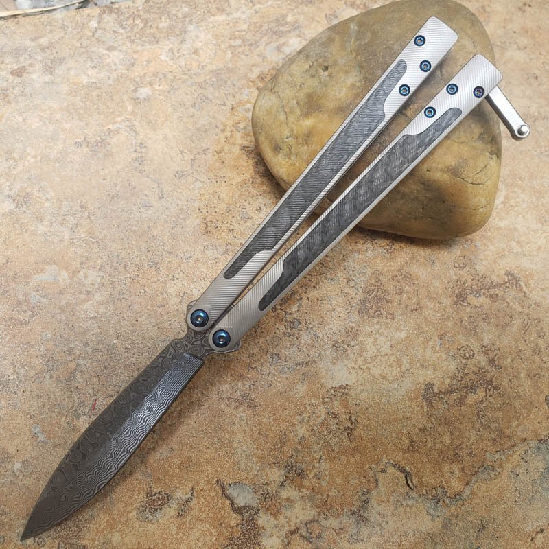 THEONE Titanium handle with carbon fiber inlay EX-10 Damascus butterfly slash knife